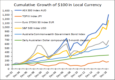 Not all equity returns derived from offshore markets have performed as well as the S&P 500 Index (yellow line) and the ASX 300 Index (dark blue line). The Euro Stoxx 50 index (grey line) has built up accumulated gains to this level three times in the last 30 years, only to have been destroyed by a whopping 40-50% twice in the past. It took the Euro Stoxx 50 Index eight to 10 years to re-accumulate to the previous levels. Japanese investors, after their bubble burst in 1989, still barely accrue substantial wealth from investing in their stock market. Australian savers in short-term bank deposits would have accumulated more wealth than an investor in the Japanese equity index, but not as much as if they had invested in Australian government bonds.