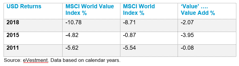If we look at downside protection in portfolios, recent history has demonstrated that Value investing, by and large, has not achieved its objective of protecting capital in negative markets. As illustrated in the table below, comparing the MSCI World Value Index vs MSCI World Index, the three negative years over the last 10 calendar years have been in 2011, 2015 and 2018, and the excess return or value-add from Value has been poor at best.